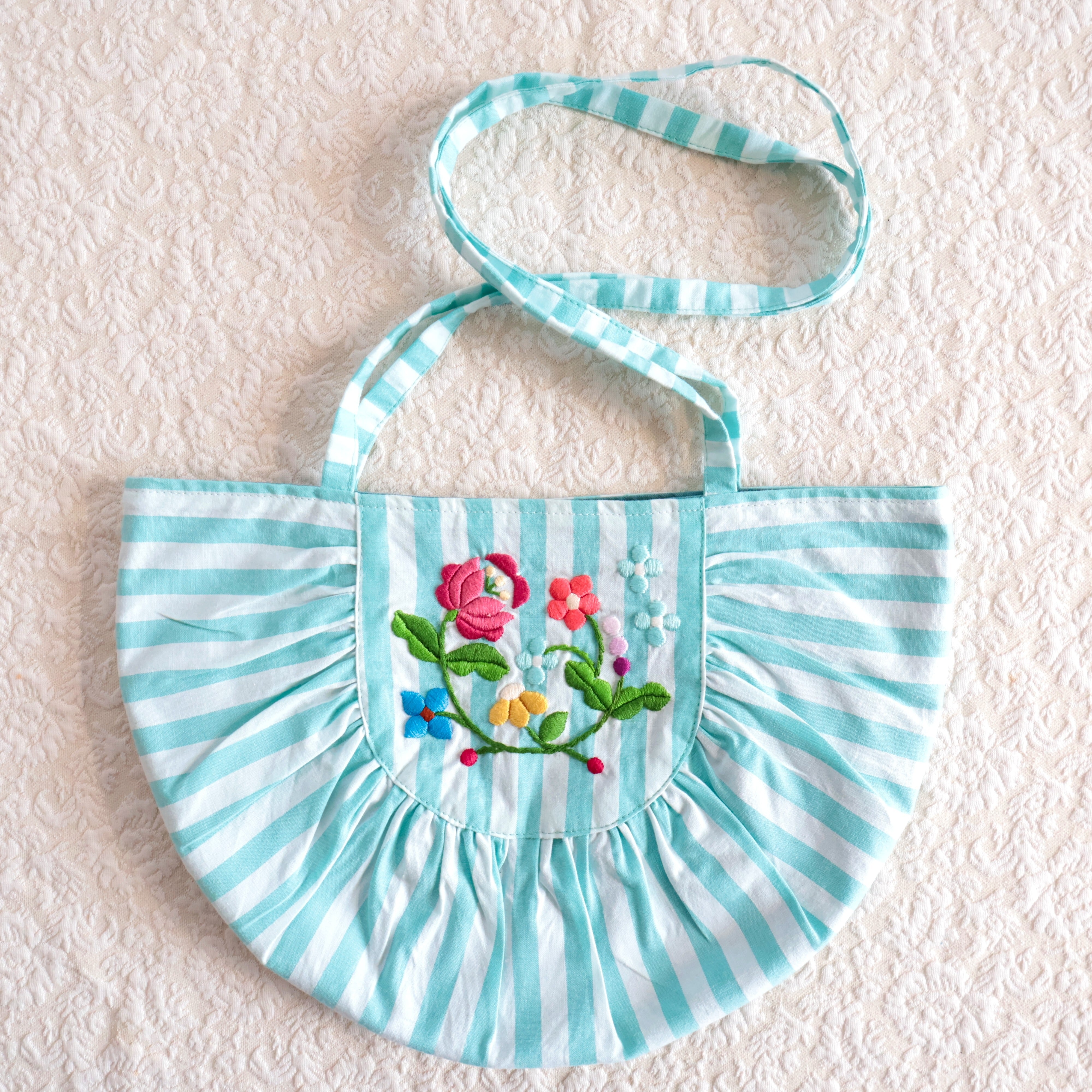 爽やかなブルーのストライプの生地に鮮やかなカロチャ刺繍を施しました。